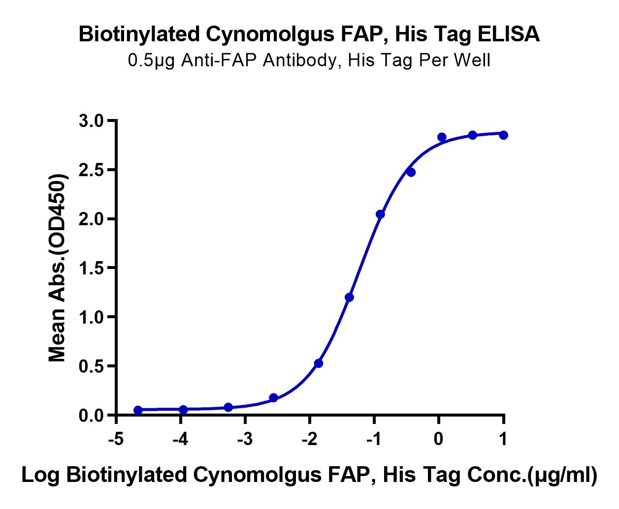 Immobilized Anti-FAP Antibody, hFc Tag at 5ug/ml (100ul/well) on the plate. Dose response curve for Biotinylated Cynomolgus FAP, His Tag with the EC50 of 58.5ng/ml determined by ELISA. See testing image for detail.