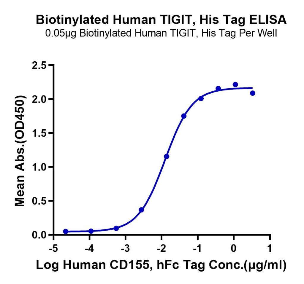 Immobilized Biotinylated Human TIGIT, His Tag at 0.5ug/ml (100ul/well) on the streptavidin precoated plate (5ug/ml). Dose response curve for Human CD155, hFc Tag with the EC50 of 12.5ng/ml determined by ELISA. See testing image for detail.