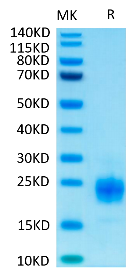 The protein has a predicted MW of 16.1 kDa. Due to glycosylation, the protein migrates to 20-25 kDa based on Tris-Bis PAGE result.