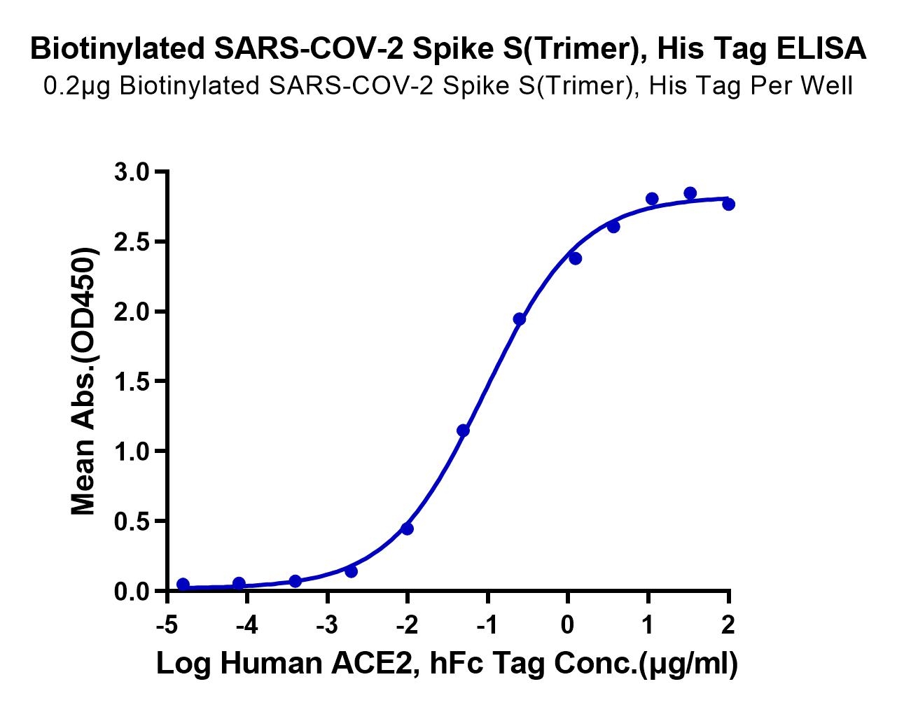 Immobilized Biotinylated SARS-COV-2 Spike S (Trimer) , His Tag at 2ug/ml (100ul/well) on the streptavidin precoated plate (5ug/ml). Dose response curve for Human ACE2, hFc Tag with the EC50 of 91.1ng/ml determined by ELISA. See testing image for detail.