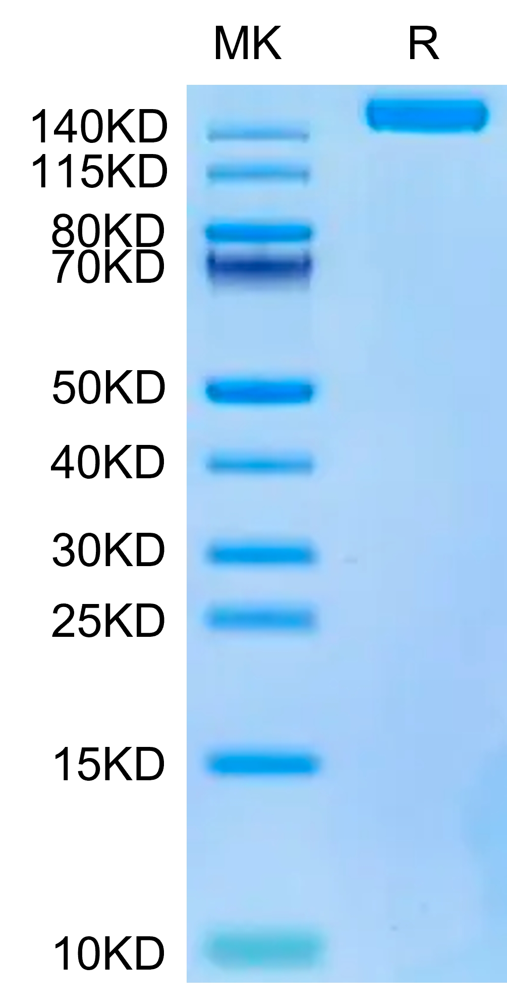 The protein has a predicted MW of 136.6 kDa. Due to glycosylation, the protein migrates to 140-170 kDa based on Tris-Bis PAGE result.
