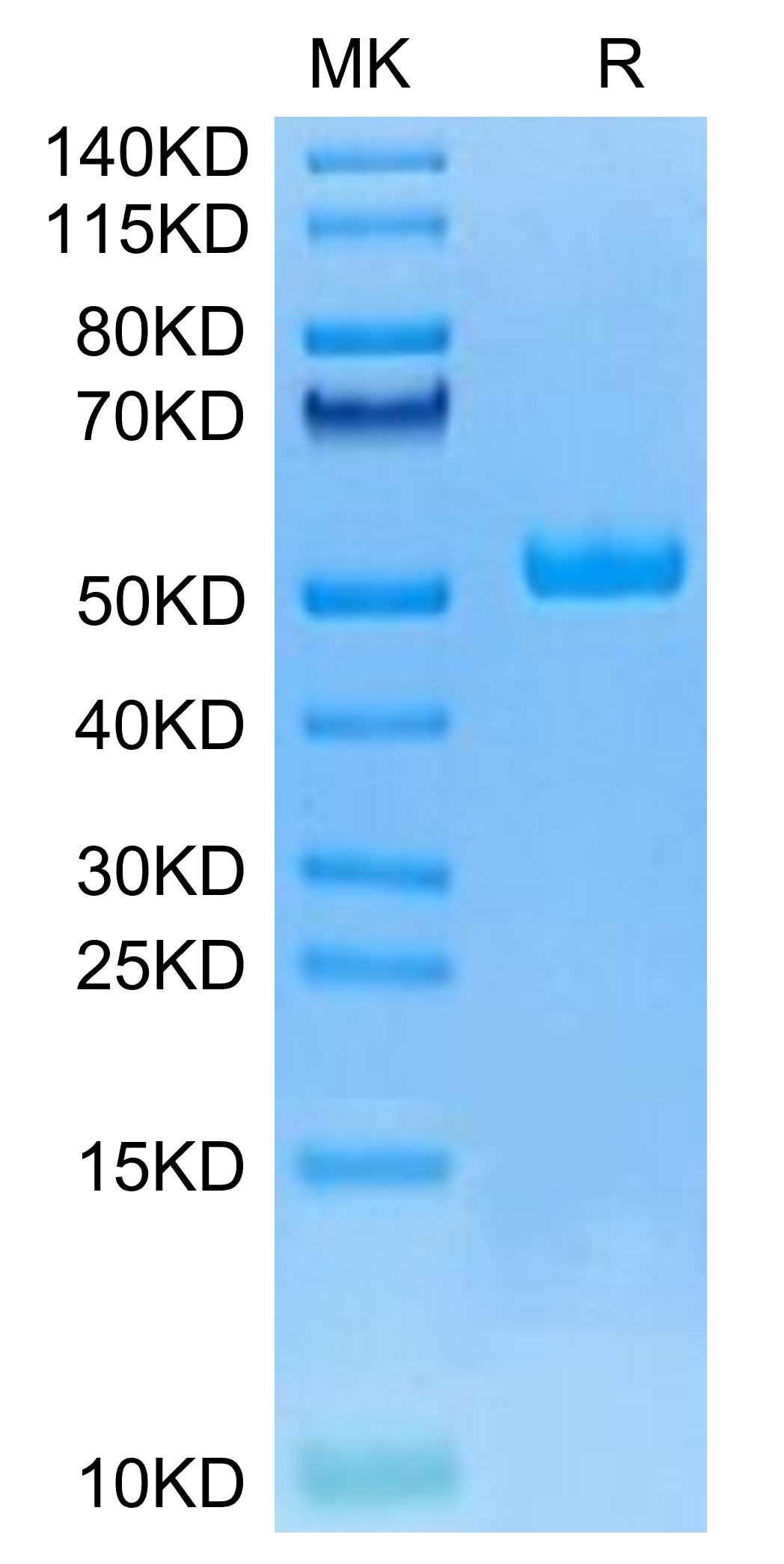 The protein has a predicted MW of 37.06 kDa. Due to glycosylation, the protein migrates to 50-60 kDa based on Tris-Bis PAGE result.
