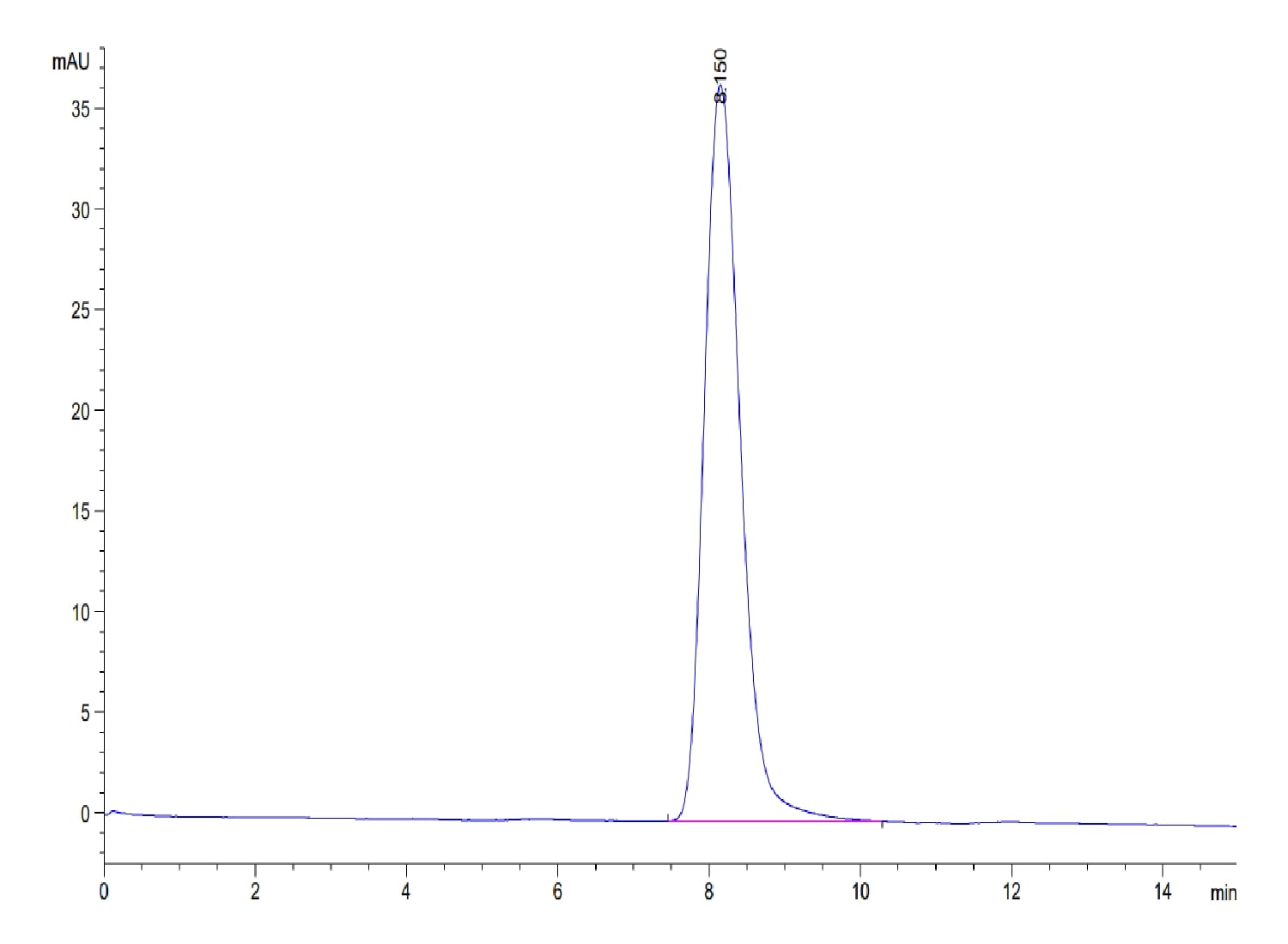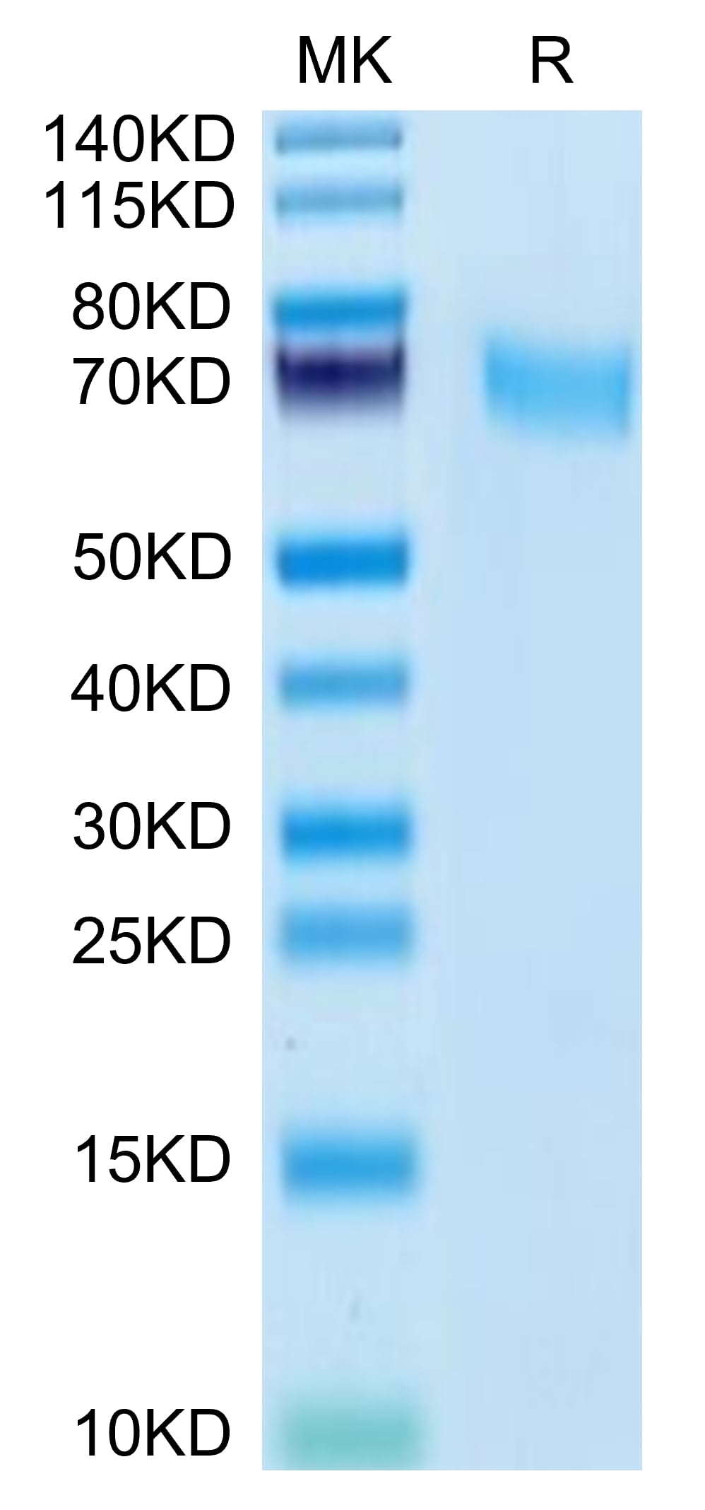 The protein has a predicted MW of 35.5 kDa. Due to glycosylation, the protein migrates to 65-70 kDa based on Tris-Bis PAGE result.