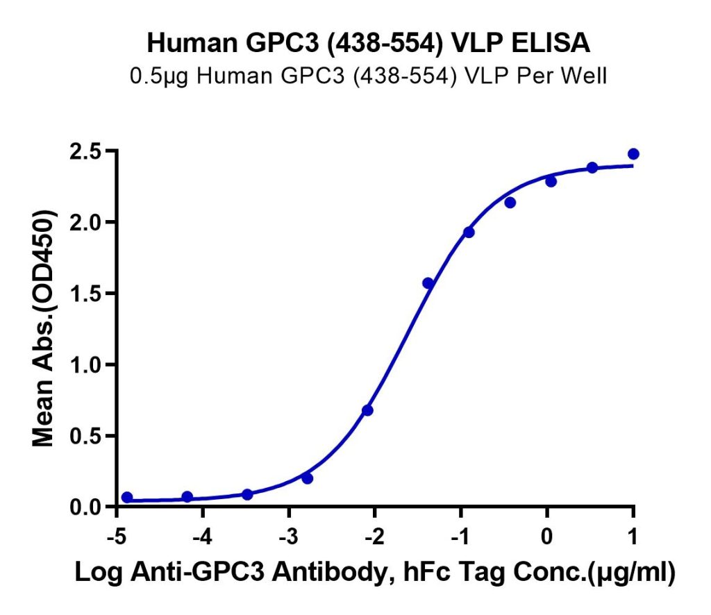 Immobilized Human GPC3 (438-554) VLP at 5ug/ml (100ul/Well) on the plate. Dose response curve for Anti-GPC3 Antibody, hFc Tag with the EC50 of 24.1ng/ml determined by ELISA. See testing image for detail.
