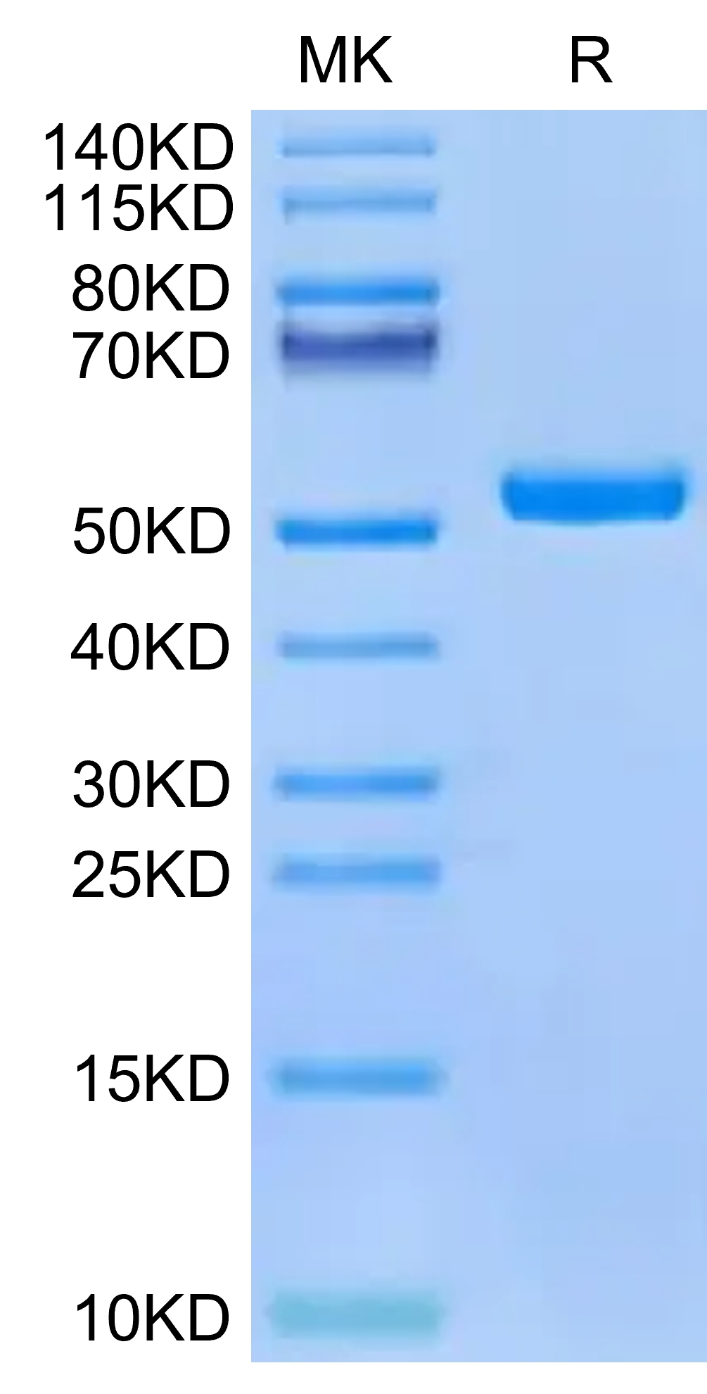 The protein has a predicted MW of 50.40 kDa. Due to glycosylation, the protein migrates to 51-58 kDa based on Tris-Bis PAGE result.