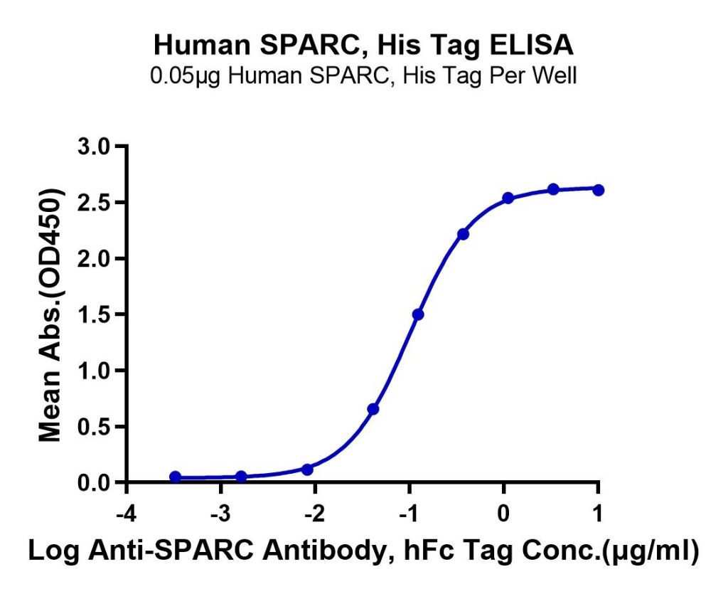 Immobilized Human SPARC, His Tag at 0.5ug/ml (100ul/Well) on the plate. Dose response curve for Anti-SPARC Antibody, hFc Tag with the EC50 of 0.10ug/ml determined by ELISA. See testing image for detail.