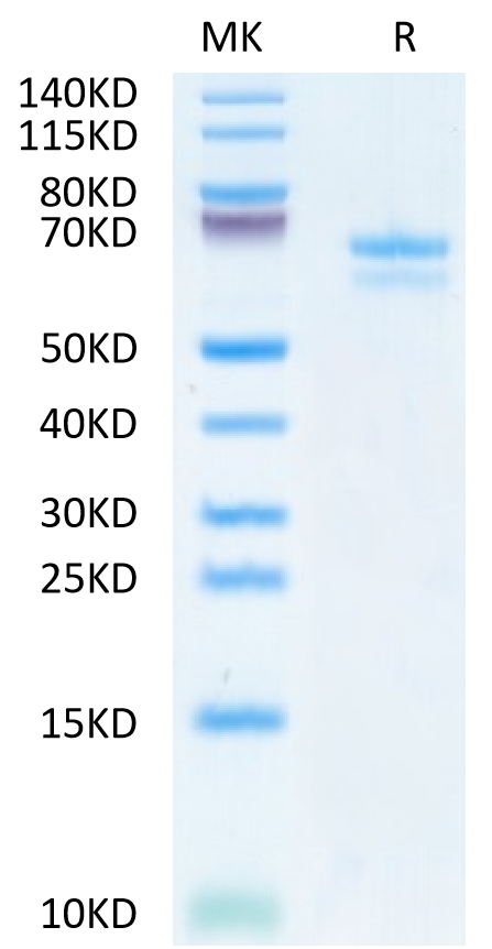 The protein has a predicted MW of 53.37 kDa. Due to glycosylation, the protein migrates to 60-70 kDa based on Tris-Bis PAGE result.