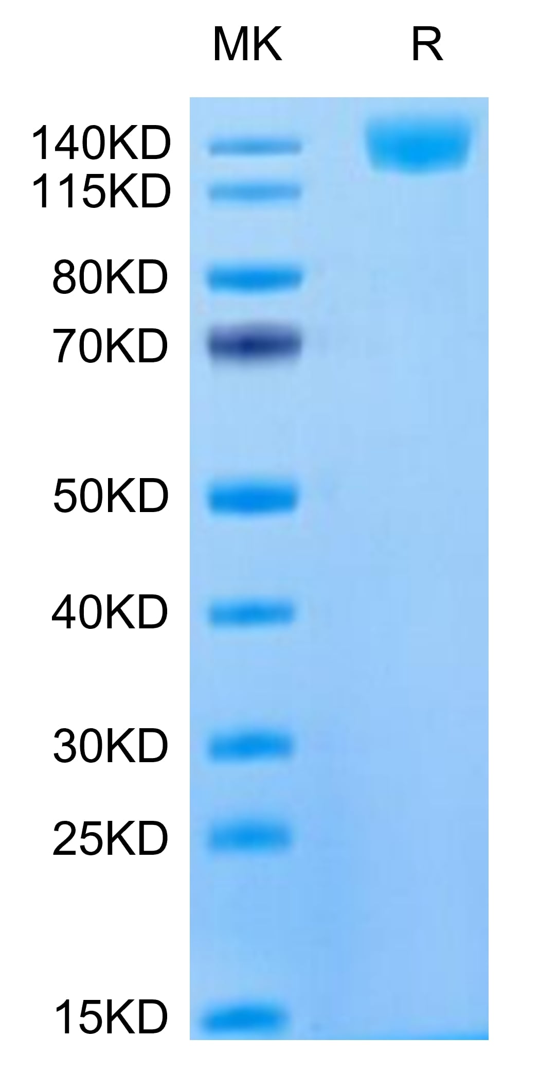 The protein has a predicted MW of 106.03 kDa. Due to glycosylation, the protein migrates to 130-150 kDa based on Tris-Bis PAGE result.