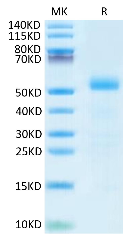 The protein has a predicted MW of 49.02 kDa. Due to glycosylation, the protein migrates to 52-60 kDa based on Tris-Bis PAGE result.