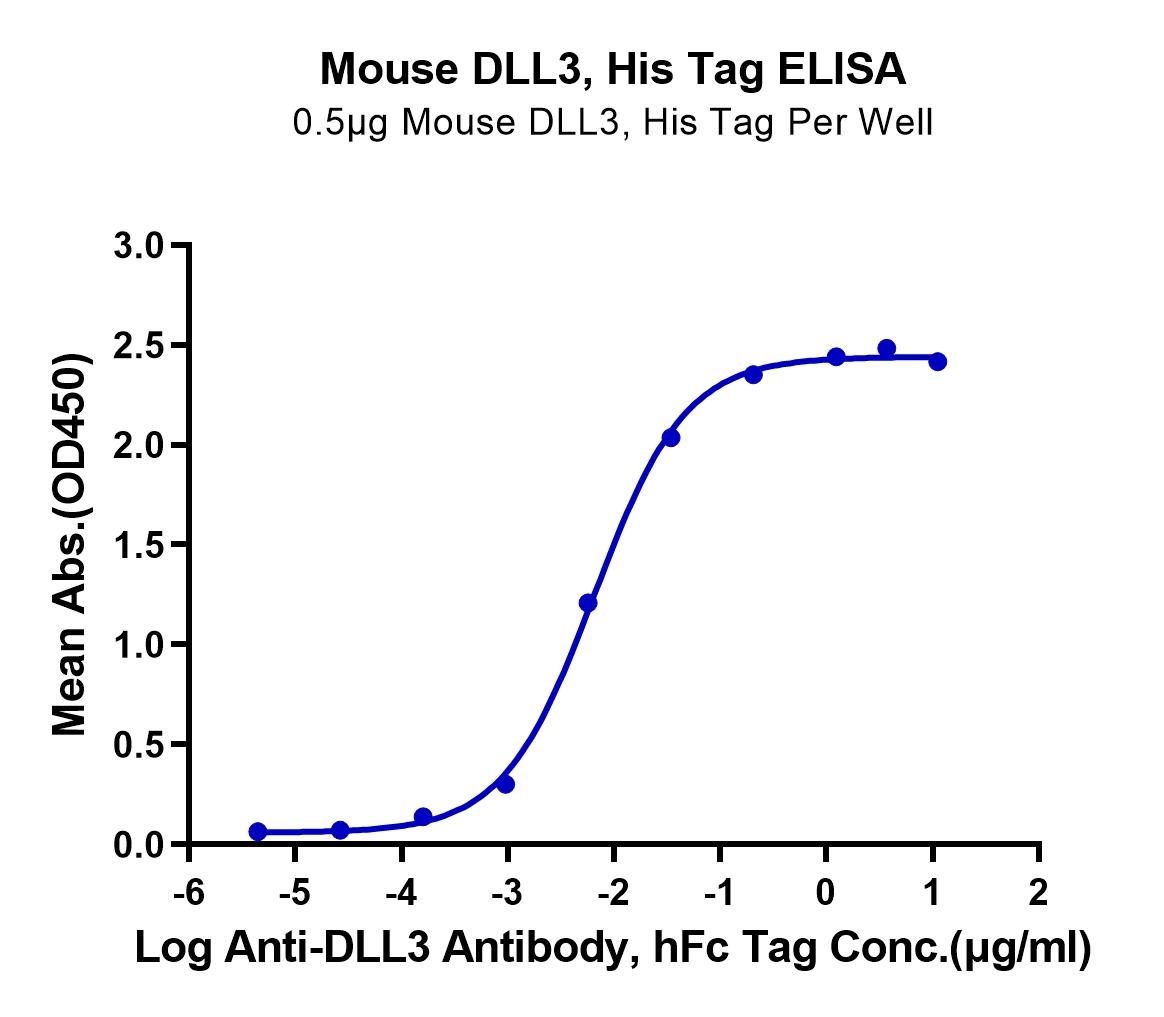 Immobilized Mouse DLL3, His Tag at 5ug/ml (100ul/well) on the plate. Dose response curve for Anti-DLL3 Antibody, hFc Tag with the EC50 of 6.5ng/ml determined by ELISA. See testing image for detail.