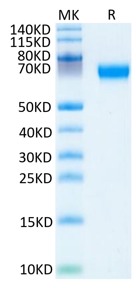 The protein has a predicted MW of 50 kDa. Due to glycosylation, the protein migrates to 65-70 kDa based on Tris-Bis PAGE result.