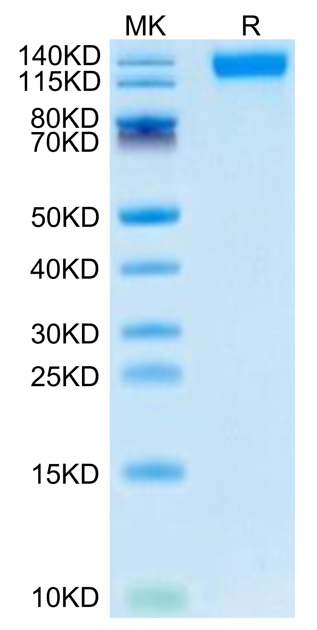 The protein has a predicted MW of 76.38 kDa. Due to glycosylation, the protein migrates to 130-145 kDa based on Tris-Bis PAGE result.