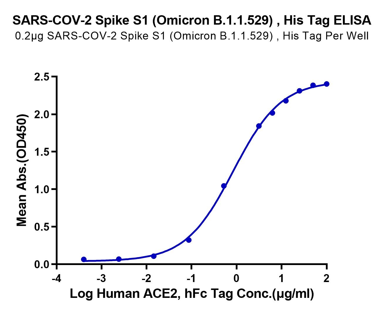 Immobilized Human ACE2, hFc Tag at 2ug/ml (100ul/well) on the plate. Dose response curve for SARS-COV-2 Spike S1 (Omicron B.1.1.529) , His Tag with the EC50 of 0.8ug/ml determined by ELISA. See testing image for detail.