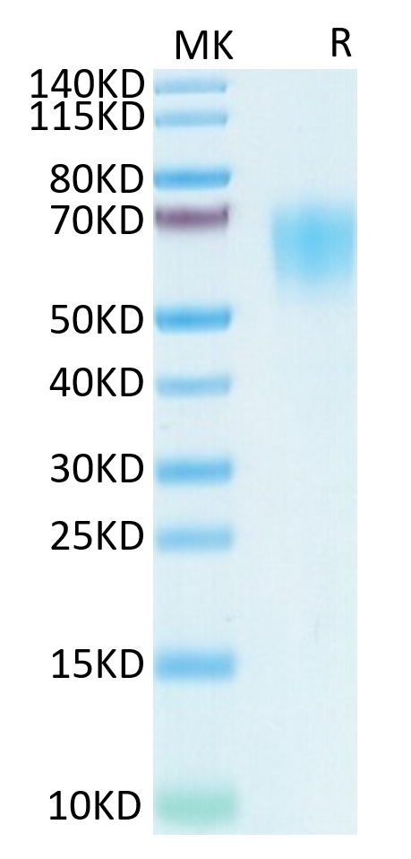 The protein has a predicted MW of 35 kDa. Due to glycosylation, the protein migrates to 55-70 kDa based on Tris-Bis PAGE result.