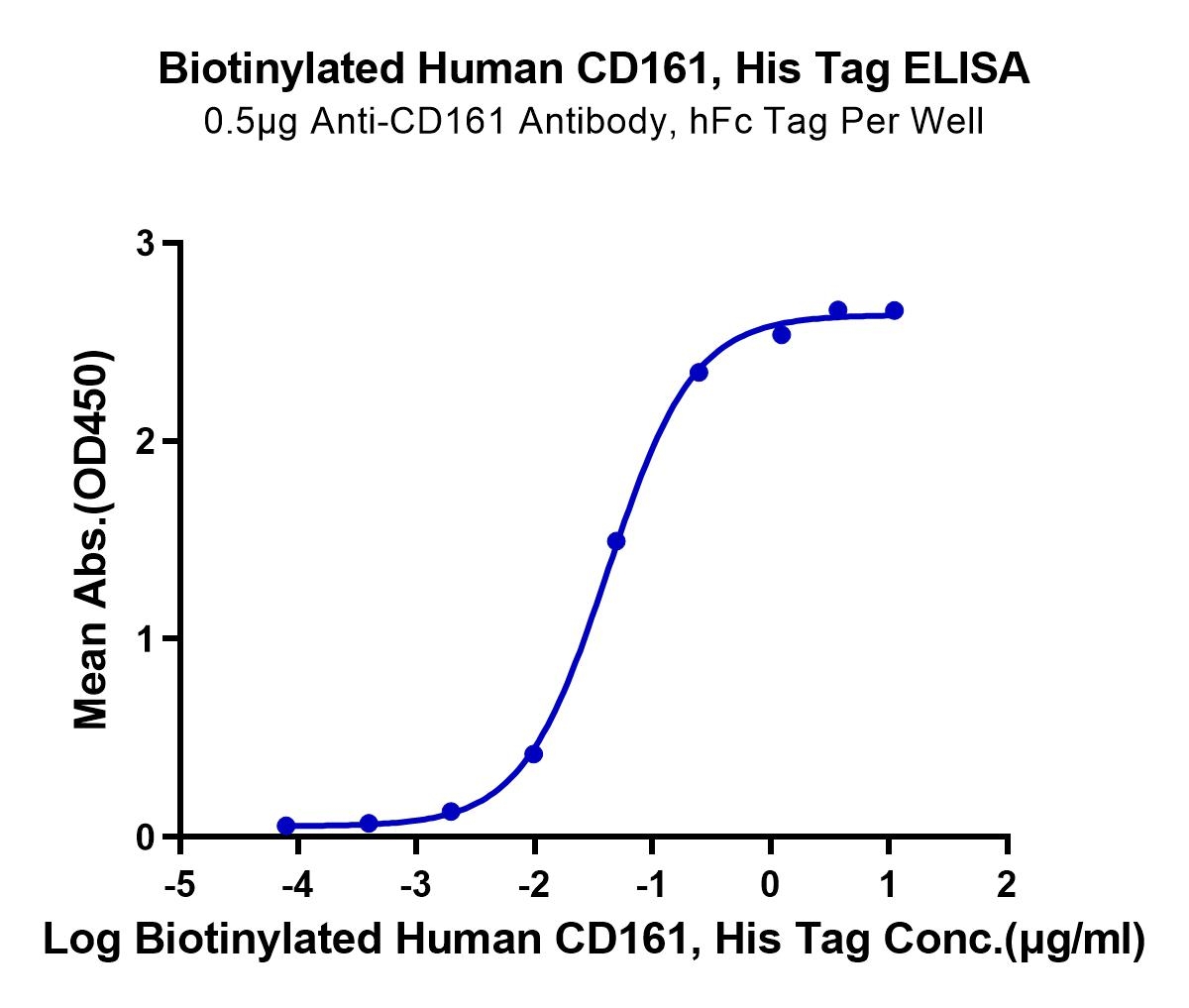 Immobilized Anti-CD161 Antibody, hFc Tag at 5ug/ml (100ul/well) on the plate. Dose response curve for Biotinylated Human CD161, His Tag with the EC50 of 41.8ng/ml determined by ELISA. See testing image for detail.