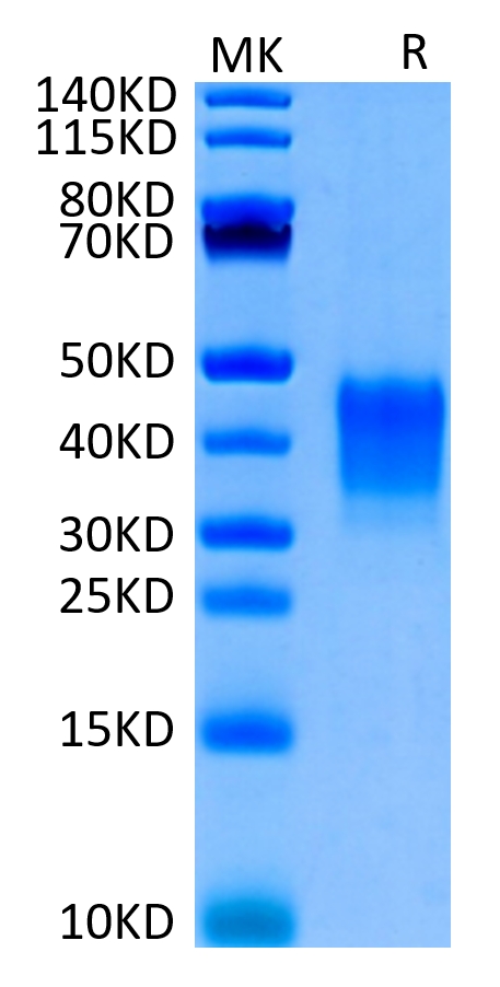 The protein has a predicted MW of 19.3 kDa. Due to glycosylation, the protein migrates to 34-48 kDa based on Tris-Bis PAGE result.