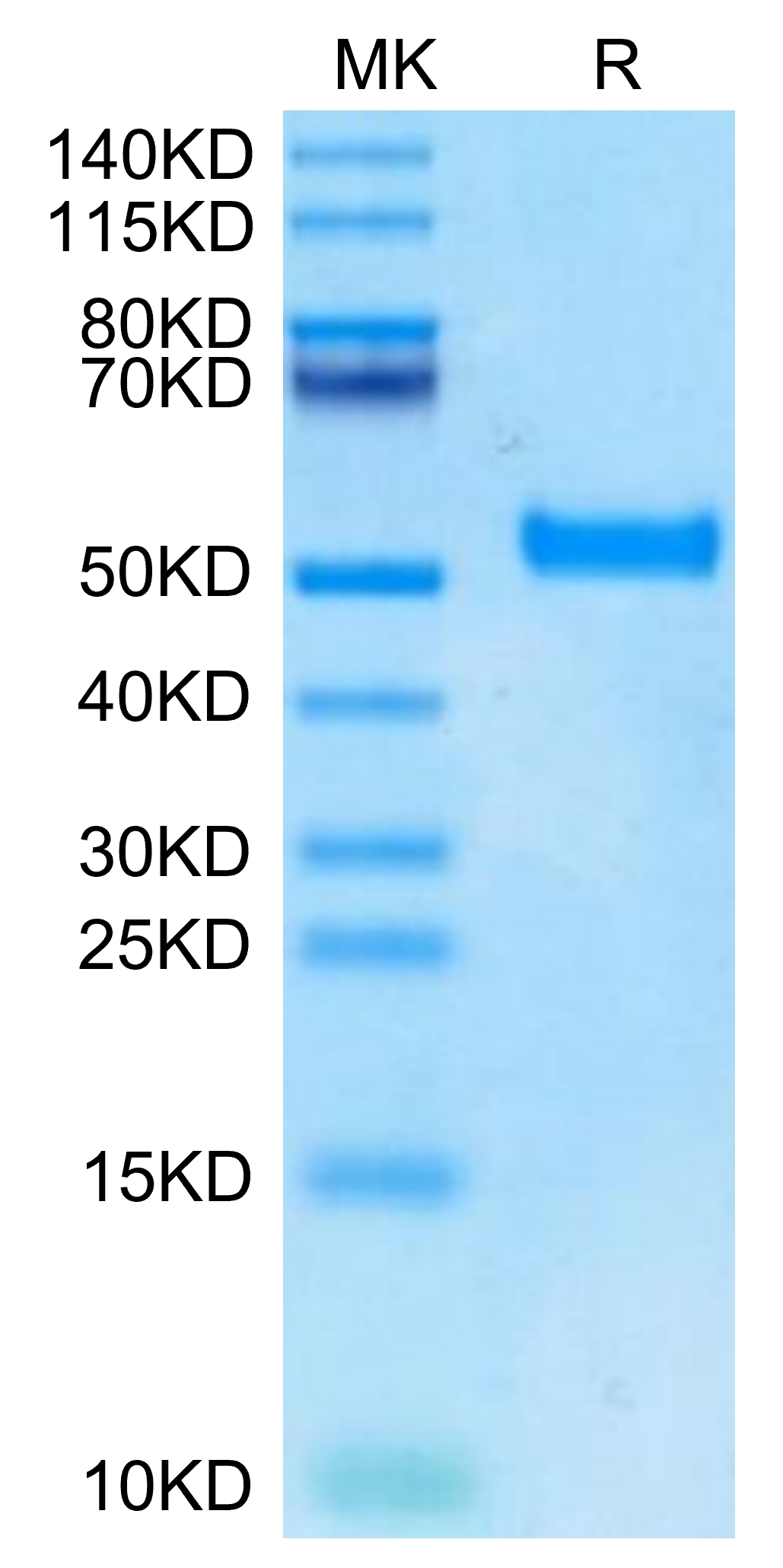 The protein has a predicted MW of 40.25 kDa. Due to glycosylation, the protein migrates to 50-60 kDa based on Tris-Bis PAGE result.