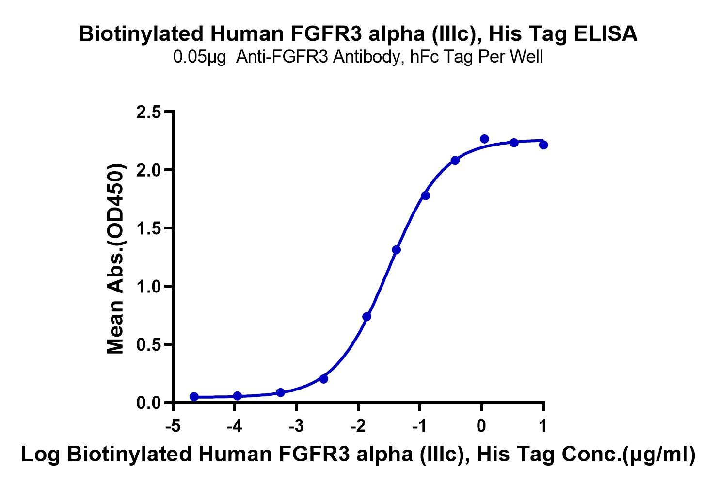 Immobilized Anti-FGFR3 Antibody, hFc Tag at 0.5ug/ml (100ul/well) on the plate. Dose response curve for Biotinylated Human FGFR3 alpha (IIIc) , His Tag with the EC50 of 31.2ng/ml determined by ELISA. See testing image for detail.