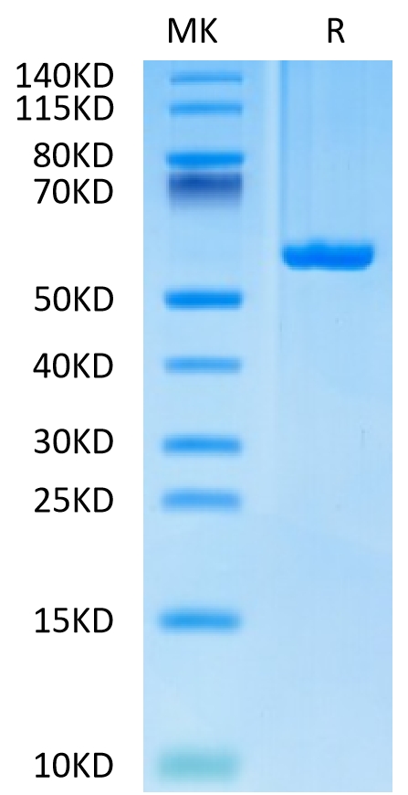 The protein has a predicted MW of 50.30 kDa. Due to glycosylation, the protein migrates to 55-65 kDa based on Tris-Bis PAGE result.