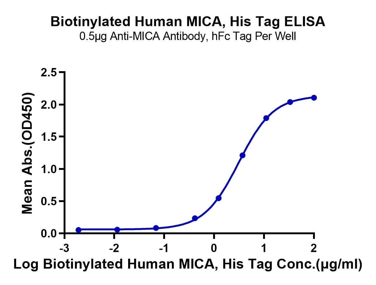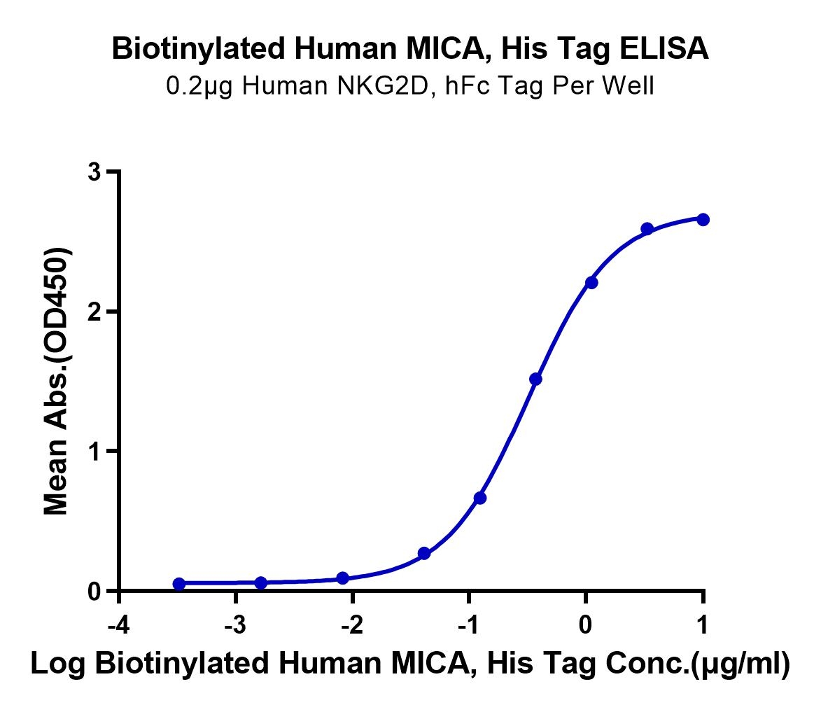 Immobilized Human NKG2D, hFc Tag at 2ug/ml (100ul/well) on the plate. Dose response curve for Biotinylated Human MICA, His Tag with the EC50 of 0.32ug/ml determined by ELISA (QC Test). See testing image for detail.