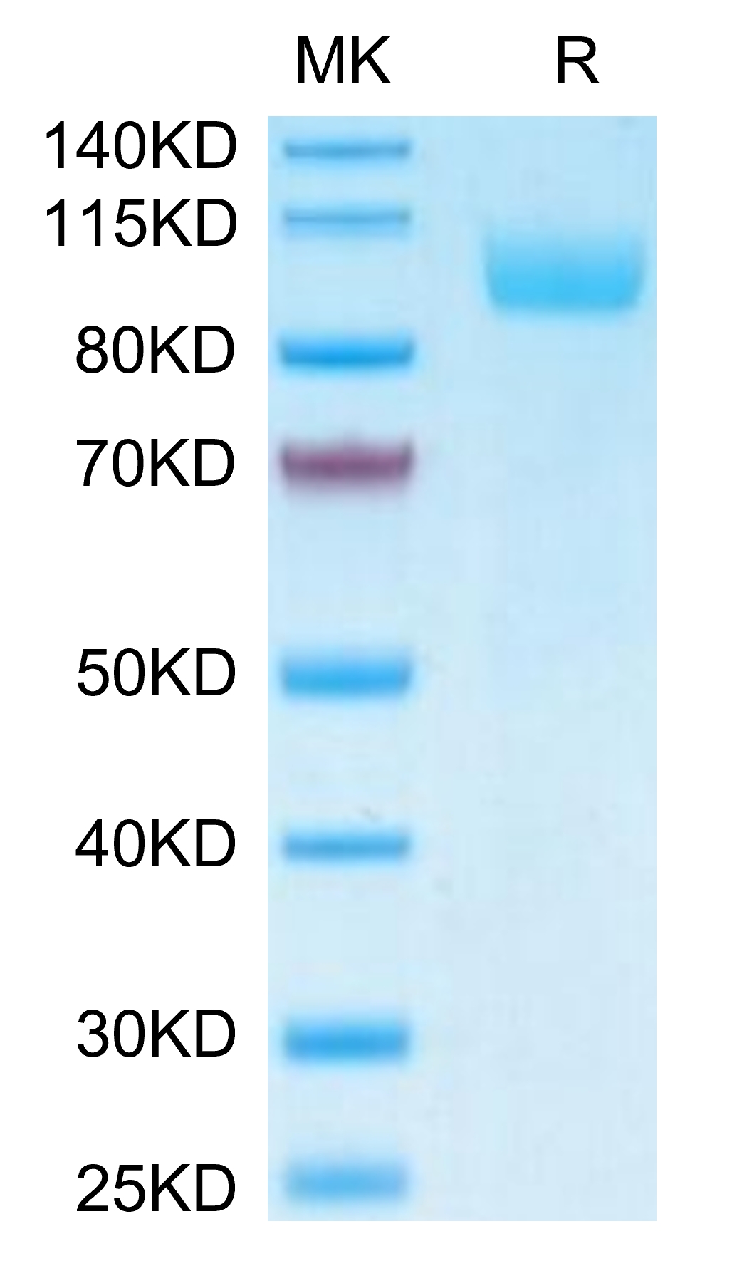 The protein has a predicted MW of 73.1 kDa. Due to glycosylation, the protein migrates to 90-115 kDa based on Tris-Bis PAGE result.