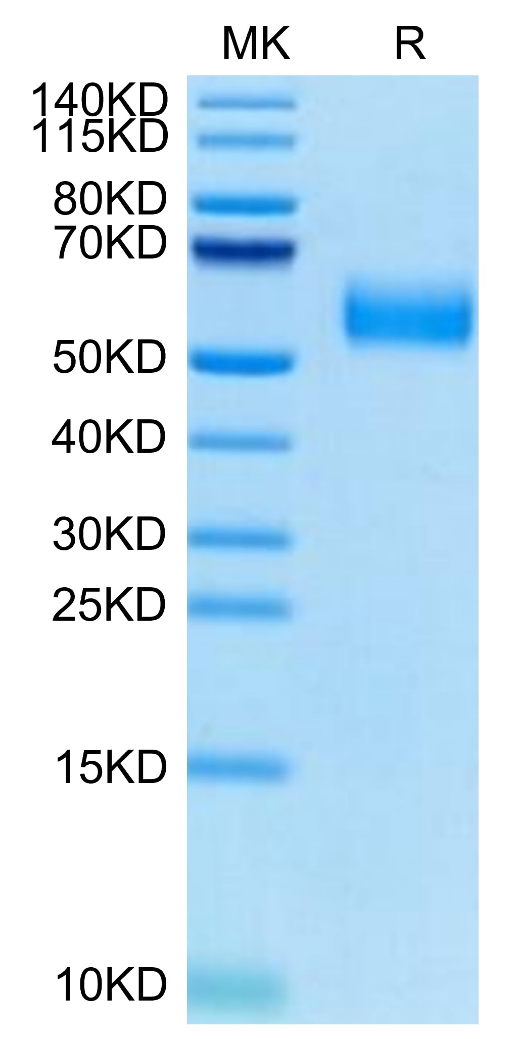 The protein has a predicted MW of 40.1 kDa. Due to glycosylation, the protein migrates to 52-68 kDa based on Tris-Bis PAGE result.