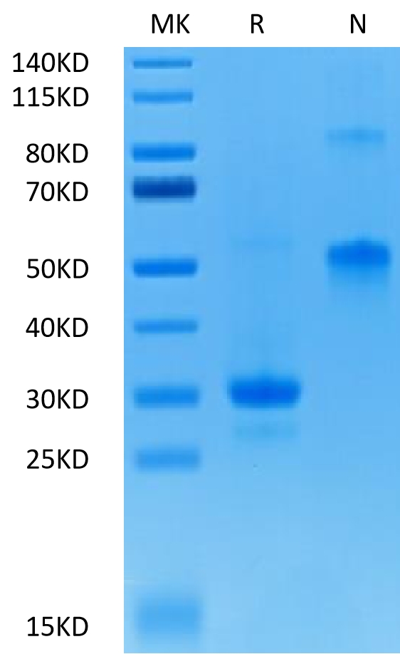 The protein has a predicted MW of 22.2 kDa. Due to glycosylation, the protein migrates to 28-35 kDa under reduced (R) condition, 45-60 kDa under Non reducing (N) condition based on Tris-Bis PAGE result.