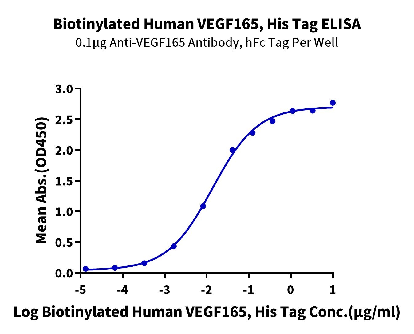 Recombinant Biotinylated Human VEGF165 Protein is expressed from HEK293 with His tag and Avi tag at the C-terminal.It contains Ala27-Arg191.