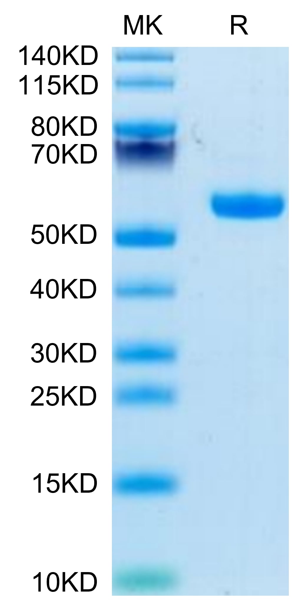 The protein has a predicted MW of 41.7 kDa. Due to glycosylation, the protein migrates to 55-60 kDa based on Tris-Bis PAGE result.