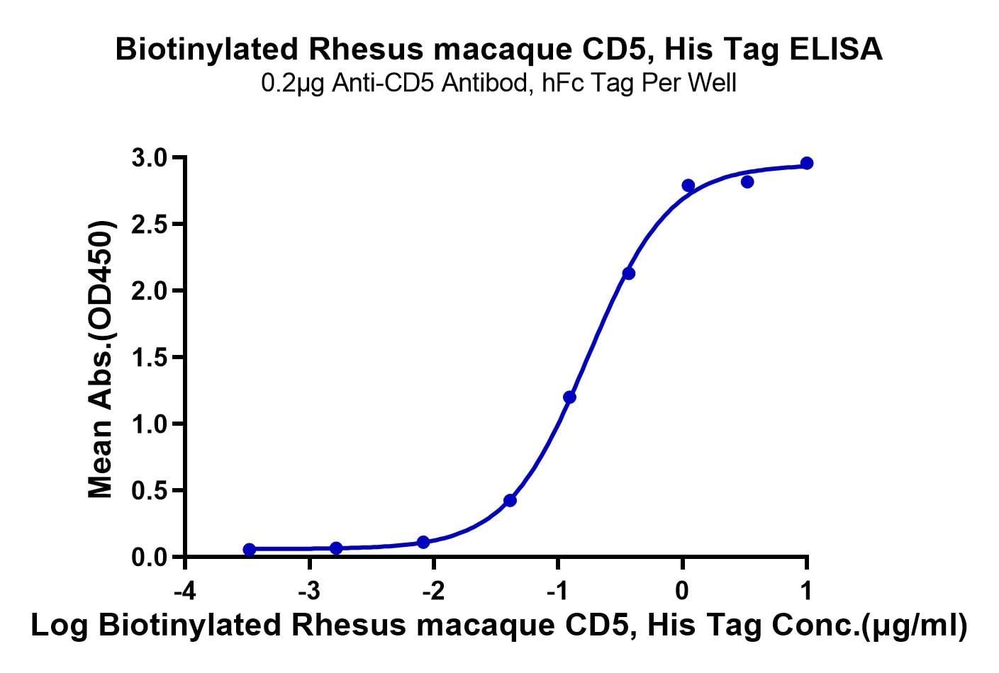 Immobilized Anti-CD5 Antibody at 2ug/ml (100ul/Well) on the plate. Dose response curve for Biotinylated Rhesus macaque CD5, His Tag with the EC50 of 0.17ug/ml determined by ELISA. See testing image for detail.