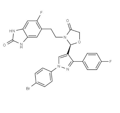 915707-65-2,(S)-2-(1-(4-bromophenyl)-3-(4-fluorophenyl)-1H-pyrazol-4-yl)-3-(2-(6-fluoro-2-oxo-2,3-dihydro-1H-benzo[d]imidazol-5-yl)ethyl)oxazolidin-4-one,1345918