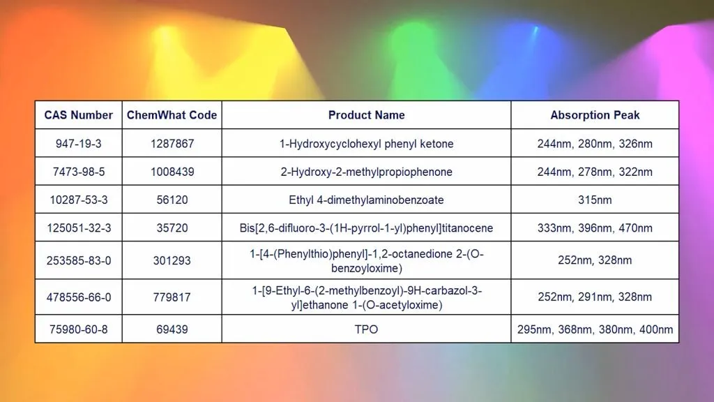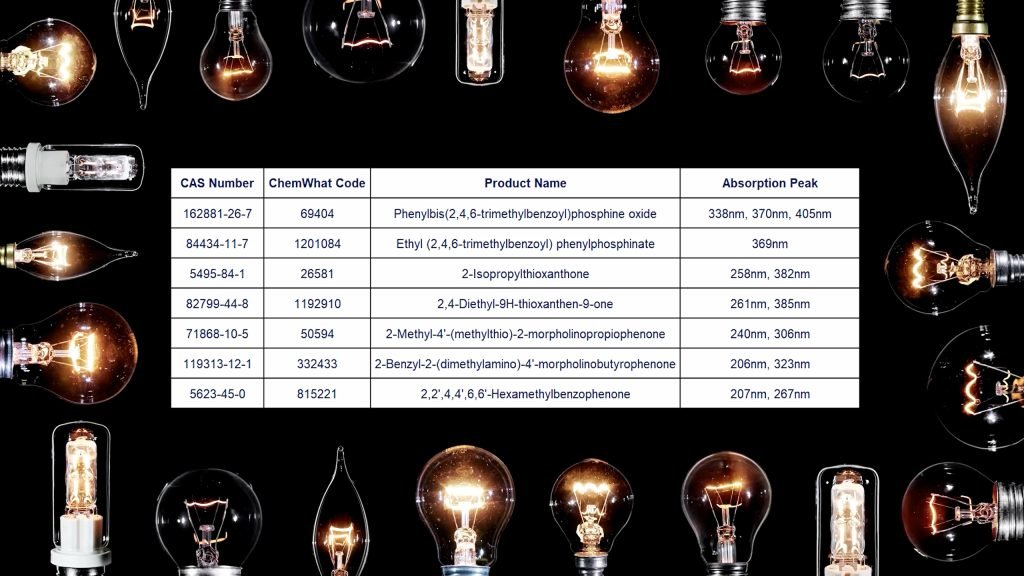 ChemWhat’s radical photoinitiator series is known for its high efficiency, stability, and low yellowing, covering the full spectrum from short wavelengths (250 nm) to long wavelengths (405 nm), and is compatible with LED, mercury, and other light sources :