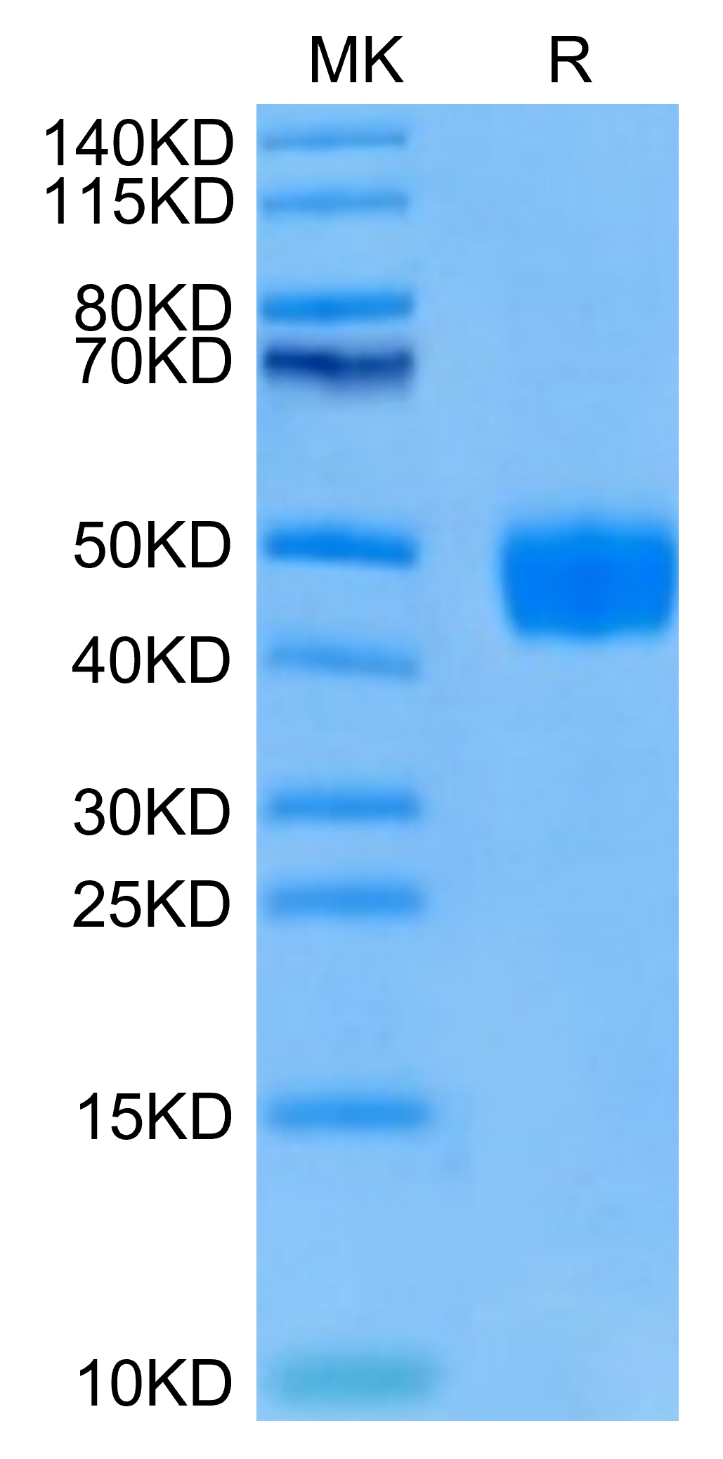 The protein has a predicted MW of 30.99 kDa. Due to glycosylation, the protein migrates to 40-50 kDa based on Tris-Bis PAGE result.