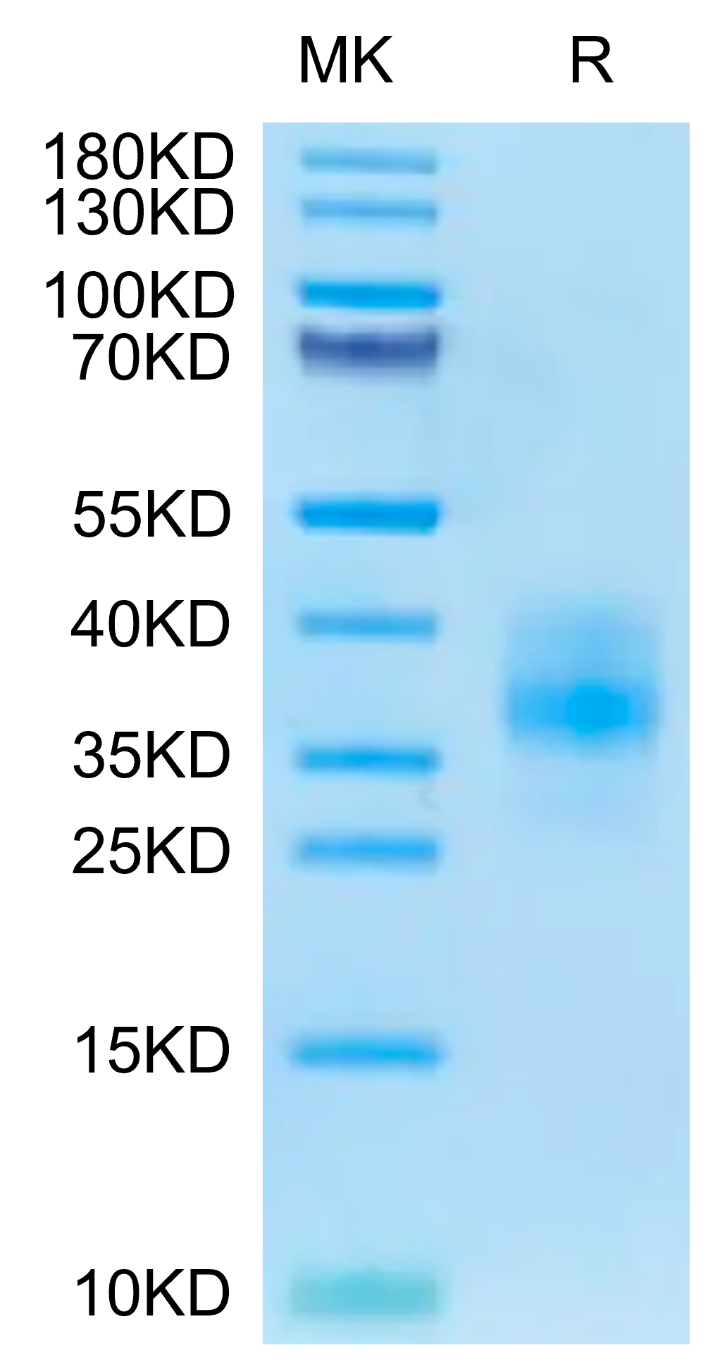 The protein has a predicted MW of 15.04 kDa. Due to glycosylation, the protein migrates to 35-40 kDa based on Tris-Bis PAGE result.