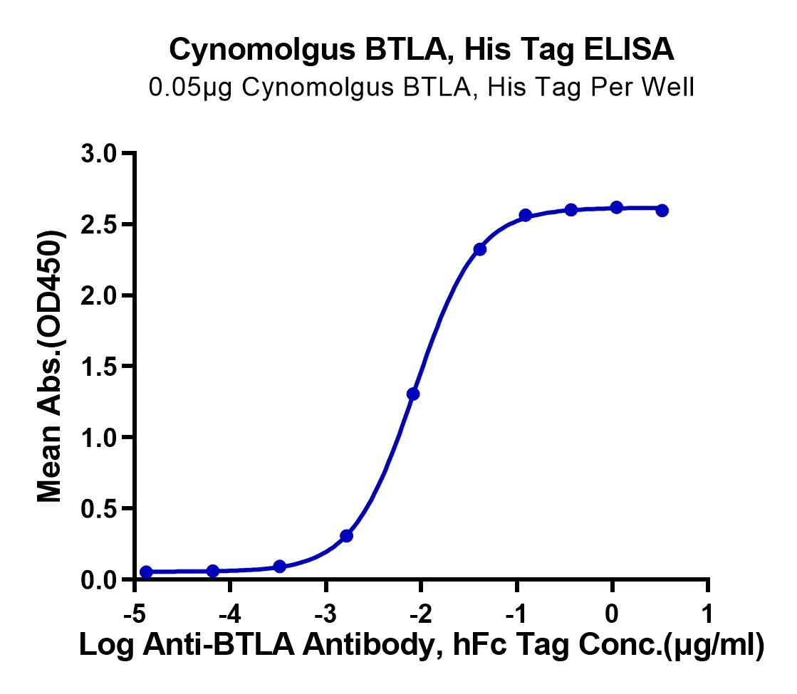 Immobilized Cynomolgus BTLA, His Tag at 0.5ug/ml (100ul/well) on the plate. Dose response curve for Anti-BTLA Antibody, hFc Tag with the EC50 of 8.6ng/ml determined by ELISA. See testing image for detail.