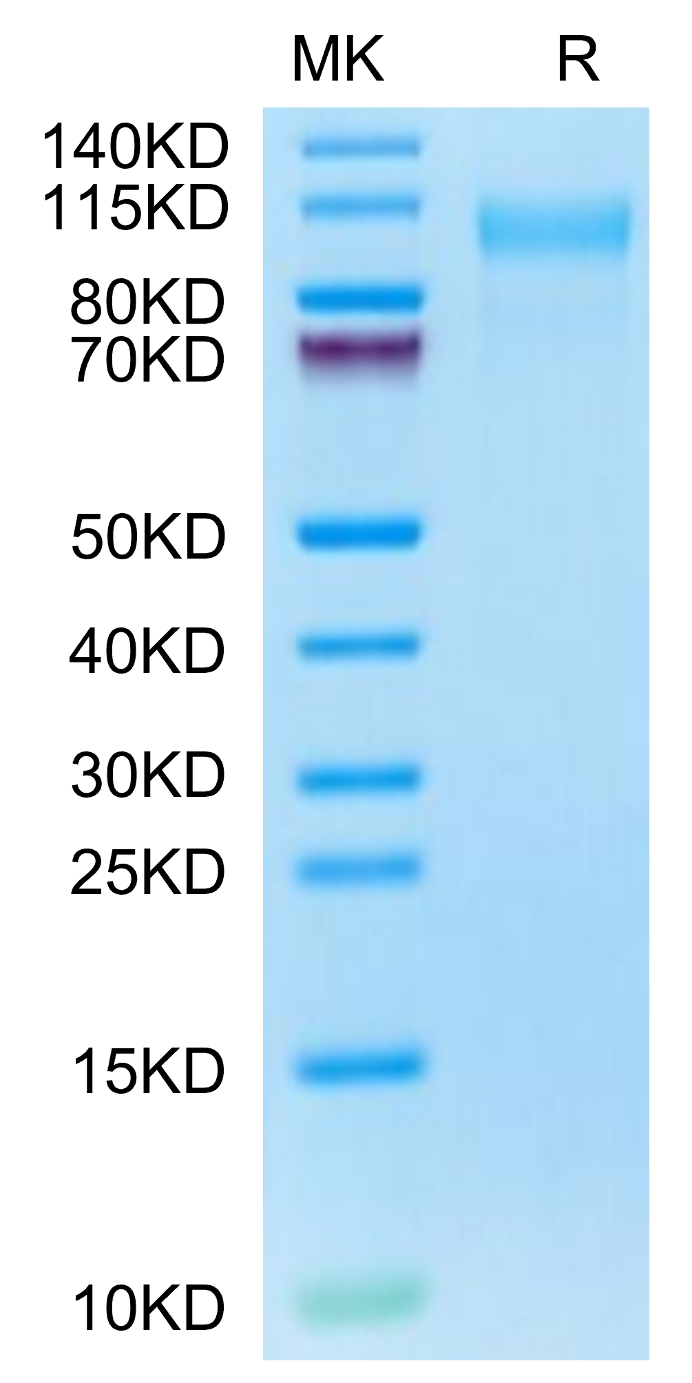 The protein has a predicted MW of 65.30 kDa. Due to glycosylation, the protein migrates to 95-115 kDa based on Tris-Bis PAGE result.