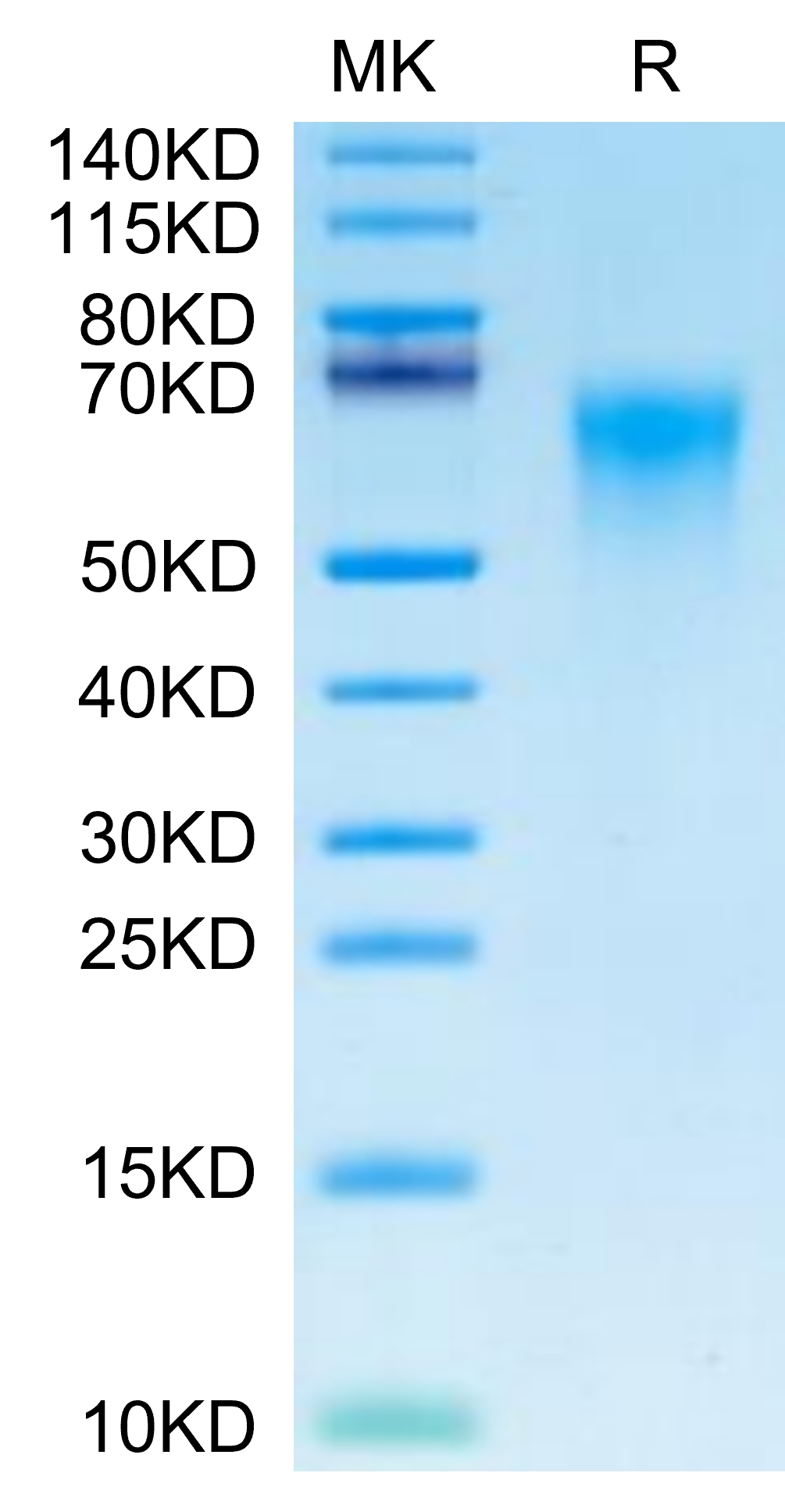 The protein has a predicted MW of 34.05 kDa. Due to glycosylation, the protein migrates to 50-70 kDa based on Tris-Bis PAGE result.