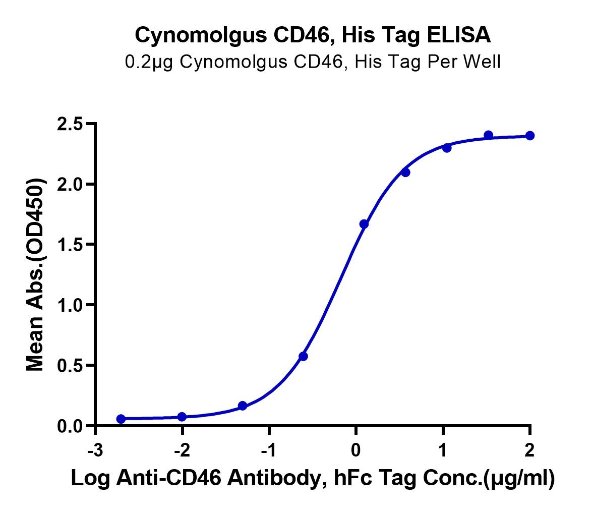 Immobilized Cynomolgus CD46, His Tag at 2ug/ml (100ul/well) on the plate. Dose response curve for Anti-CD46 Antibody, hFc Tag with the EC50 of 0.67ug/ml determined by ELISA. See testing image for detail.