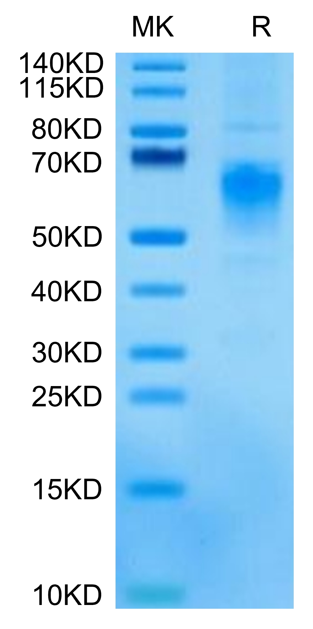 The protein has a predicted MW of 30.80 kDa. Due to glycosylation, the protein migrates to 50-70 kDa based on Tris-Bis PAGE result.