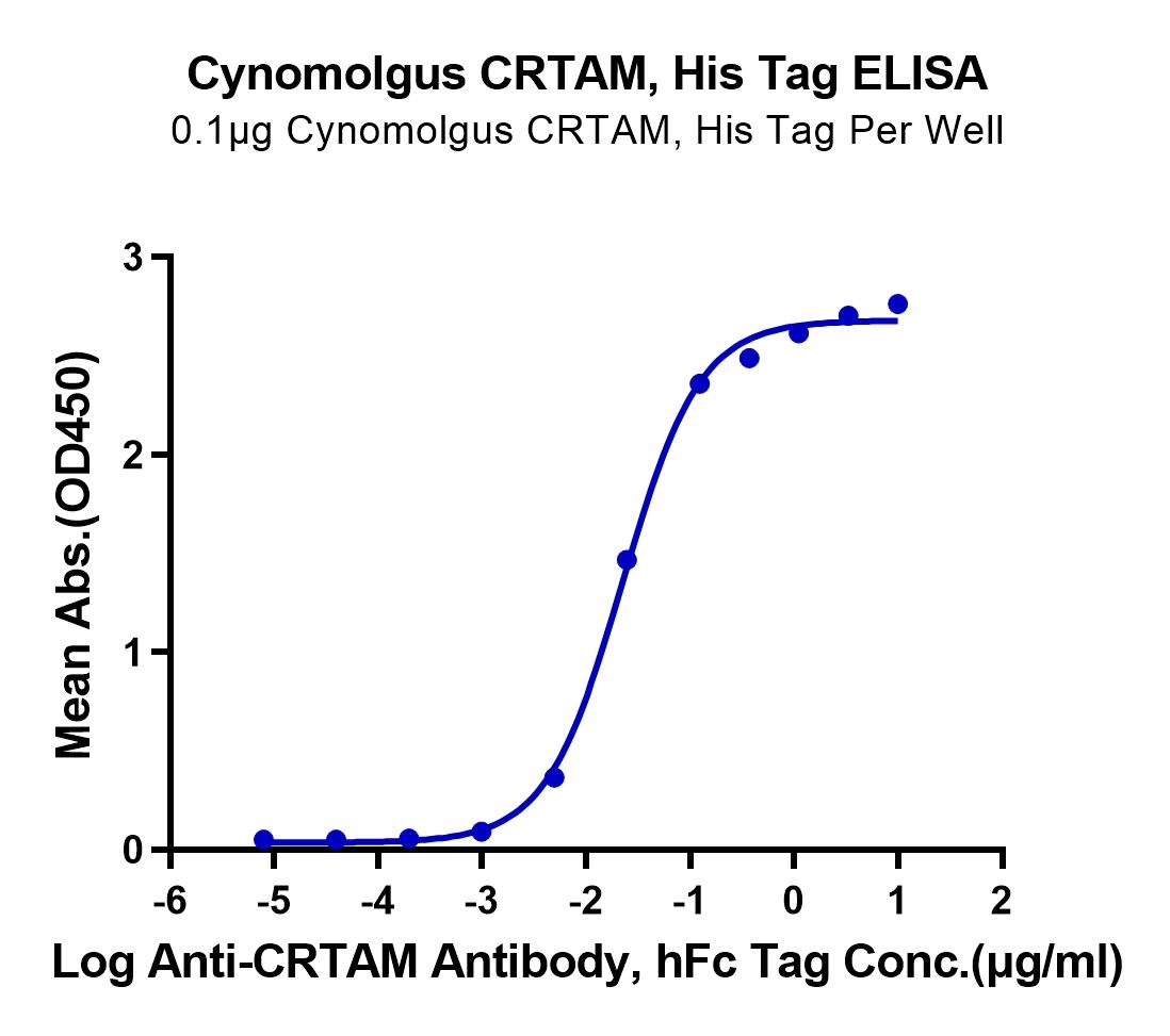Immobilized Cynomolgus CRTAM, His Tag at 1ug/ml (100ul/Well) on the plate. Dose response curve for Anti-CRTAM Antibody, hFc Tag with the EC50 of 22.6ng/ml determined by ELISA. See testing image for detail.