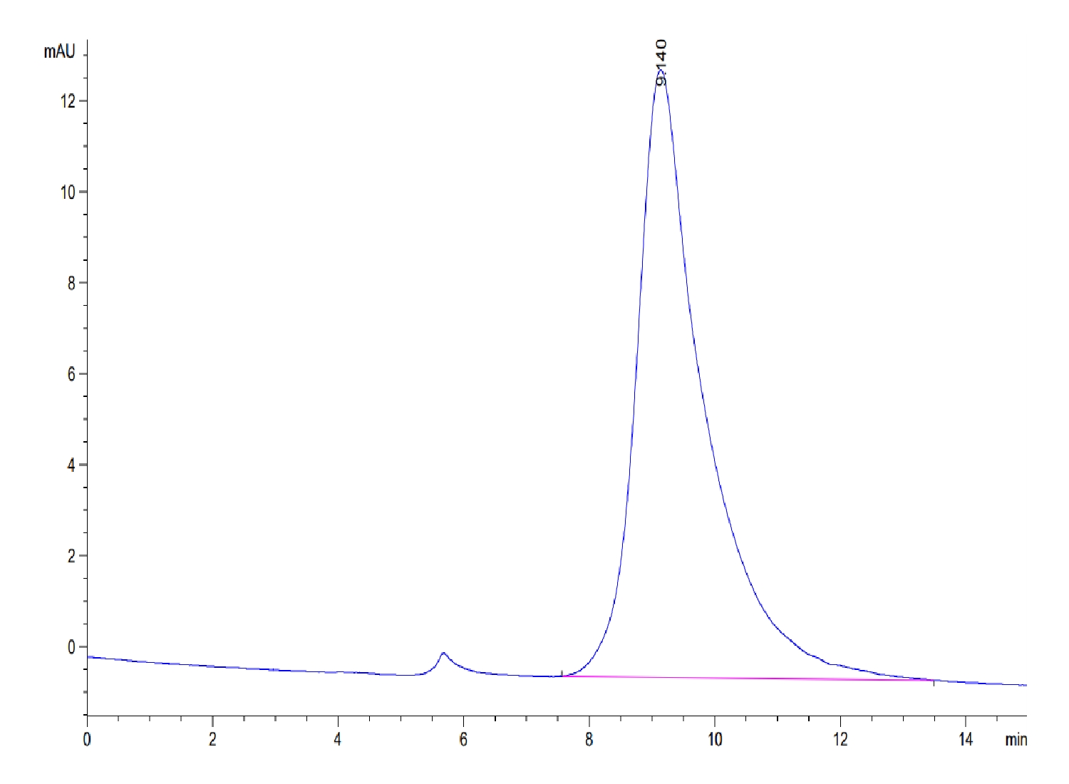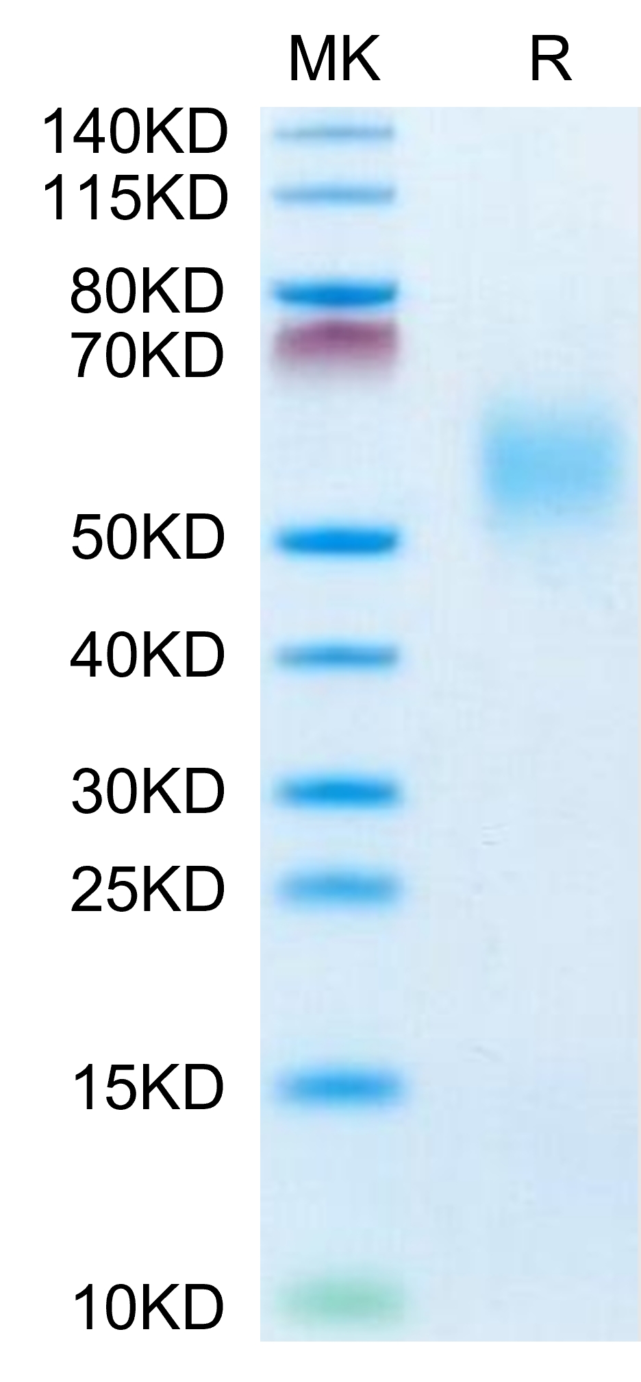 The protein has a predicted MW of 26.2 kDa. Due to glycosylation, the protein migrates to 50-68 kDa based on Tris-Bis PAGE result.