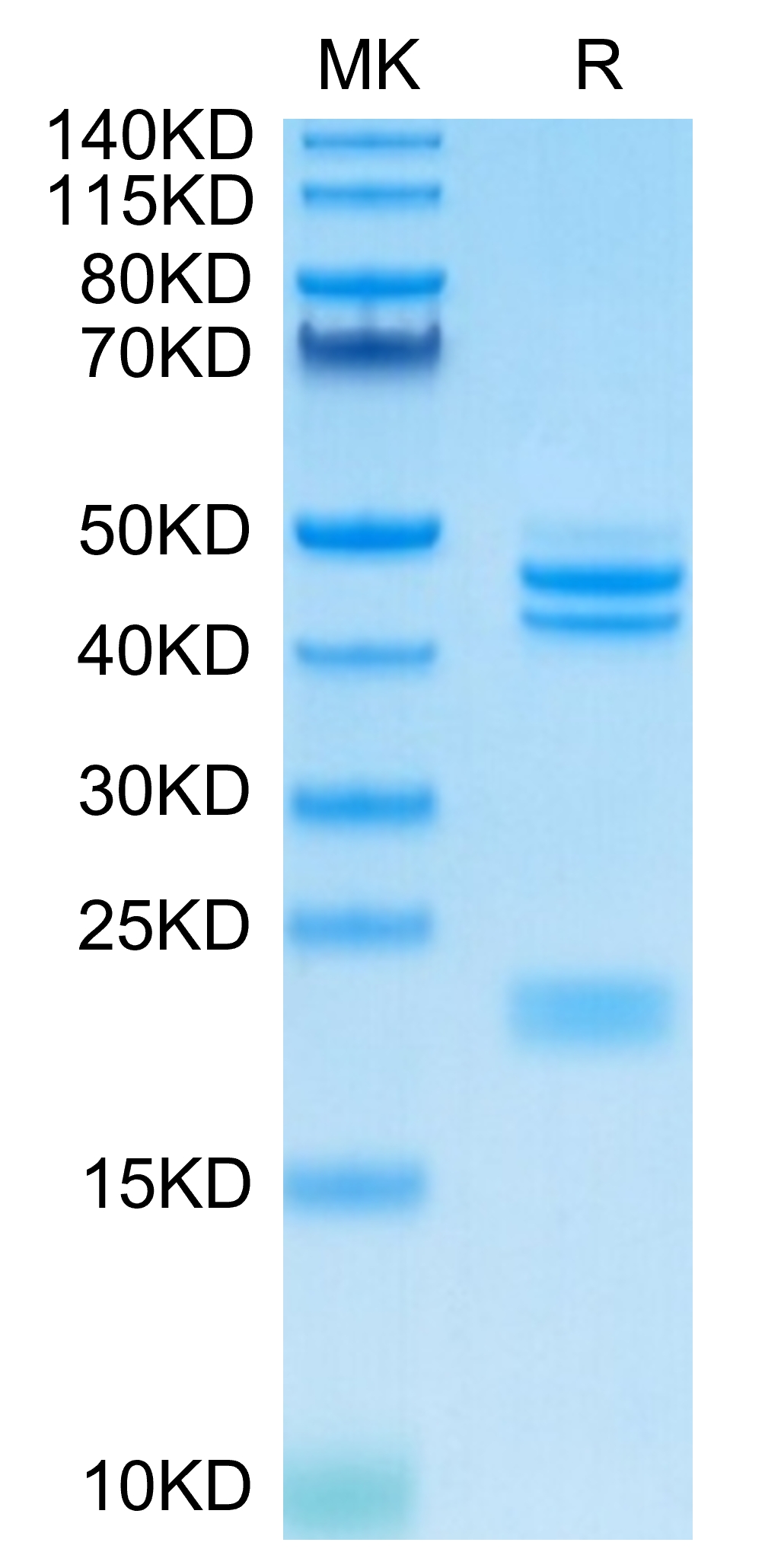 The protein has a predicted MW of 19.5 (Cynomolgus IL23 alpha)&35.8 (Mouse IL12 beta) kDa. Due to glycosylation, the protein migrates to 22 (Cynomolgus IL23 alpha)&40-50 (Mouse IL12 beta) kDa based on Tris-Bis PAGE result.