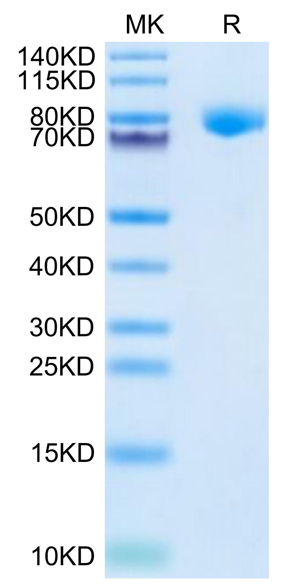The protein has a predicted MW of 70.19 kDa. Due to glycosylation, the protein migrates to 70-90 kDa based on Tris-Bis PAGE result.