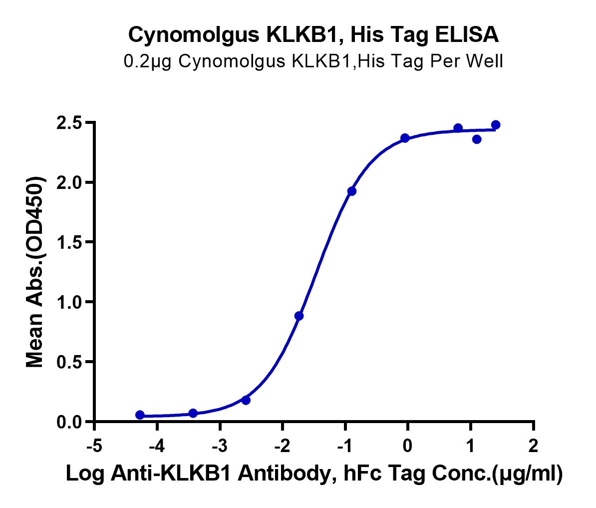 Immobilized Cynomolgus KLKB1, His Tag at 2ug/ml (100ul/well) on the plate. Dose response curve for Anti-KLKB1 Antibody, hFc Tag with the EC50 of 34.3g/ml determined by ELISA. See testing image for detail.