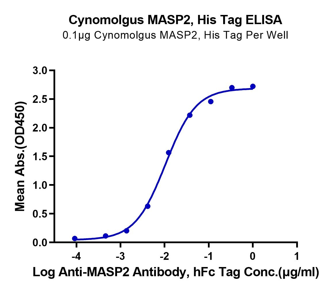 Immobilized Cynomolgus MASP2, His Tag at 1ug/ml (100ul/well) on the plate. Dose response curve for Anti-MASP2 Antibody, hFc Tag with the EC50 of 10.4ng/ml determined by ELISA. See testing image for detail.