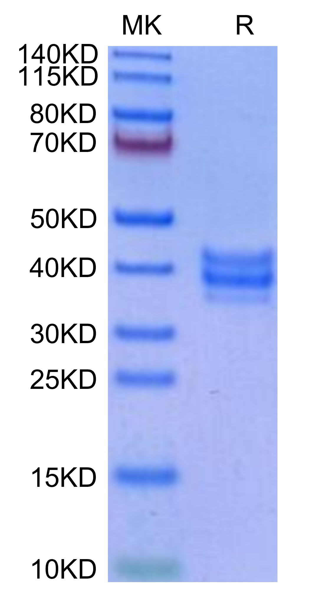 The protein has a predicted MW of 16.44kDa (NKG2C) & 18.27kDa (CD94). Due to glycosylation, the protein migrates to 35-45 kDa based on Tris-Bis PAGE result.