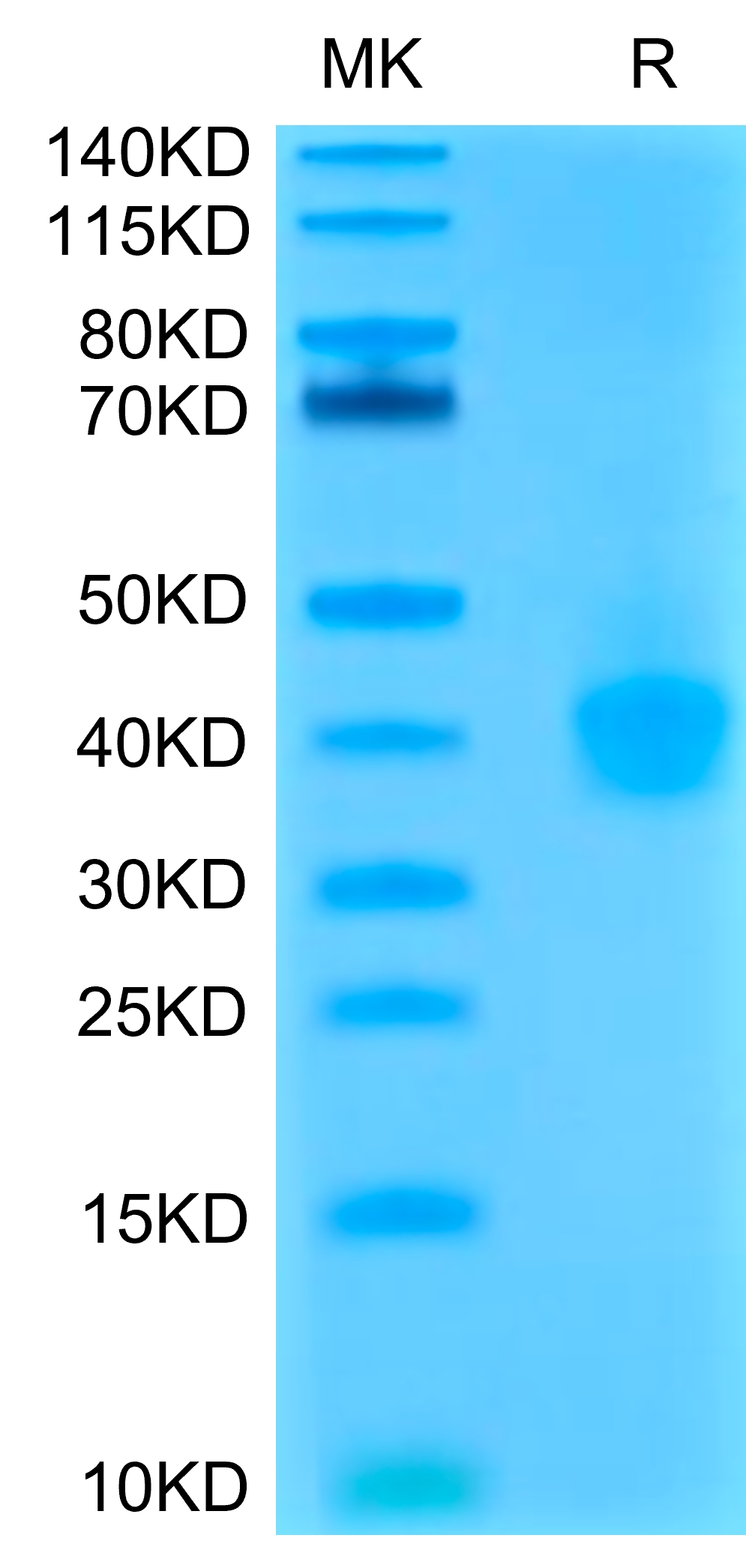 The protein has a predicted MW of 26 kDa. Due to glycosylation, the protein migrates to 35-45 kDa based on Tris-Bis PAGE result.