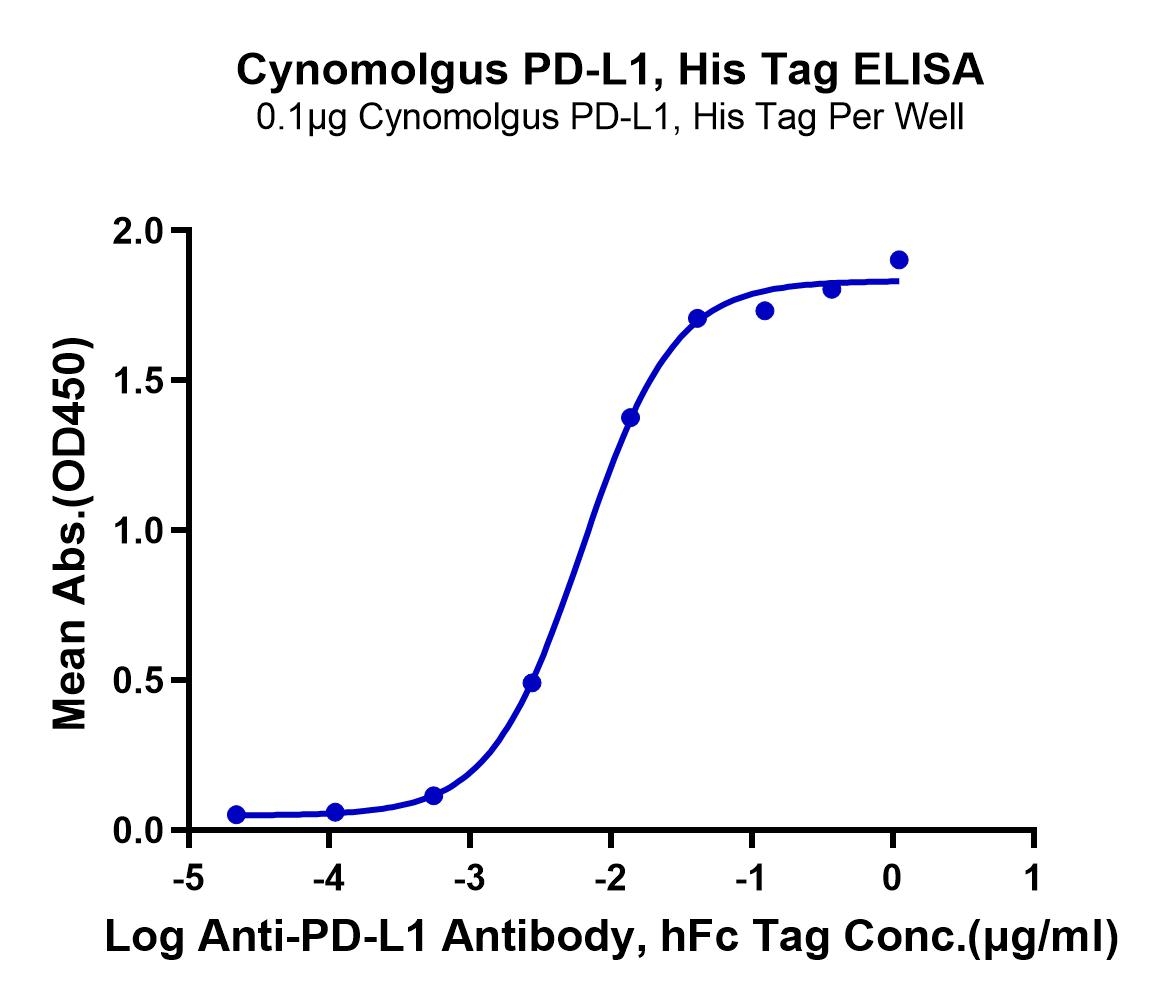 Immobilized Cynomolgus PD-L1, His Tag at 1ug/ml (100ul/Well) on the plate. Dose response curve for Anti-PD-L1 Antibody, hFc Tag with the EC50 of 6.2ng/ml determined by ELISA (QC Test). The affinity constant of 1.28 uM as determined in SPR assay (Biacore T200). See testing image for detail.