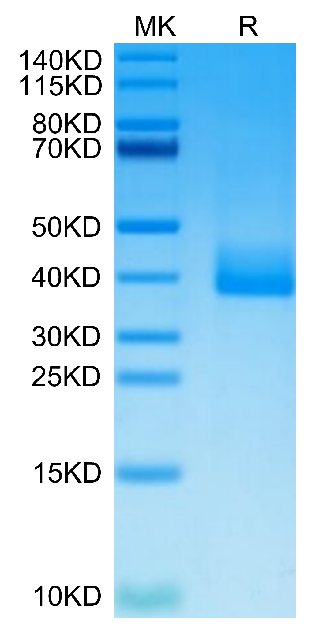 The protein has a predicted MW of 25.75 kDa. Due to glycosylation, the protein migrates to 35-50 kDa based on Tris-Bis PAGE result.