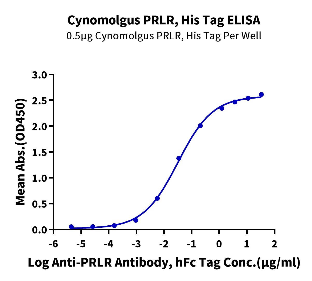 Immobilized Cynomolgus PRLR, His Tag at 5ug/ml (100ul/well) on the plate. Dose response curve for Anti-PRLR Antibody, hFc Tag with the EC50 of 34.6ng/ml determined by ELISA. See testing image for detail.